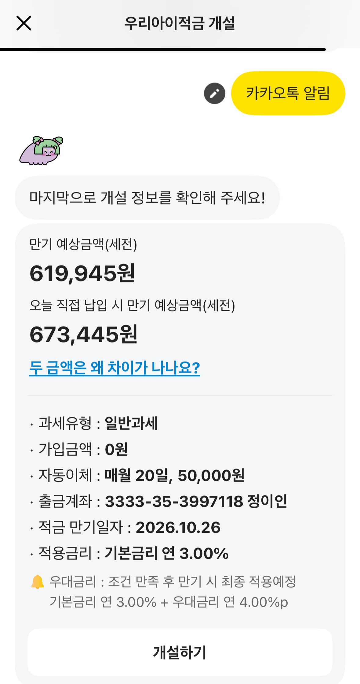 간단히 본인인증한후에 , 출금할 계좌만들고 적금개설완료!