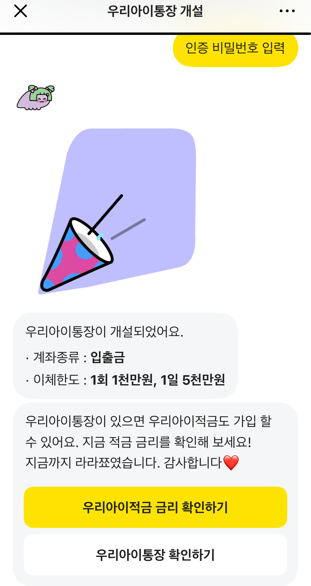아이의 첫 통장을 고민하고 있다면, 꼭 한 번 이용해보세요. 복잡한 절차 없이 간편하게 만들 수 있고, 무엇보다 ‘아이의 첫 금융습관’을 자연스럽게 만들어줄 수 있는 계기가 될 거예요.